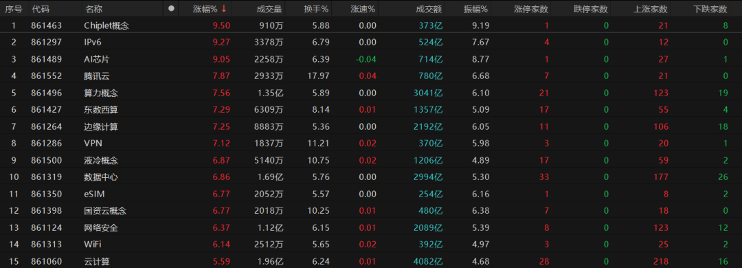 概念股方面,Chiplet概念、IPv6、AI芯片、腾讯云、算力概念、东数西算、边缘计算、VPN等概念板块涨幅靠前。黄金概念则陷入调整,跨境支付、毛发医疗、煤化工等概念跌幅靠前。