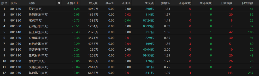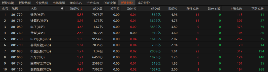 盘面上,31个申万一级行业中,共计19个行业板块收涨,12个行业板块收跌。通信、计算机、电子、传媒等行业板块涨幅居前。而银行、纺织服饰、煤炭、石油石化等行业板块领跌。