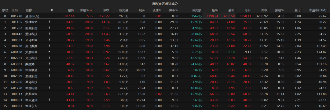 今日通信板块盘中拉升,以5.55%的整体涨幅领涨,板块内115只个股收涨,多股强势涨停,仅11只个股收跌。具体来看,锐捷网络、朗威股份、润泽科技、光环新网、奥飞数据等多股录得20CM涨停板。此外,大唐电信、光迅科技、数据港、中国联通等多股10CM涨停。