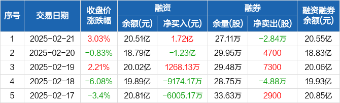 融资方面,当日融资买入4.21亿元,融资偿还2.49亿元,融资净买入1.72亿元,净买入额两市排名第16。融券方面,融券卖出1900股,融券偿还3.03万股,融券余量27.11万股,融券余额332.37万元。融资融券余额合计20.55亿元。