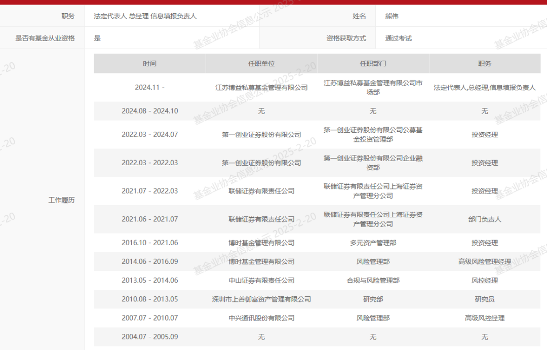 1月24日完成登记的江苏博益私募,其实际控制人熊伟则曾就职于上善御富资产、中山证券、博时基金、联储证券、第一创业证券等多家机构。与此同时,该公司的其他两位成员的从业经历也都较为丰富,其中副总经理何罡曾就职于广东证券、盈峰资本、上善御富资产、世纪恒丰资产、世纪证券、佛山康睿私募等;合规风控负责人李鑫曾就职于招商期货、博时基金、平安理财等。