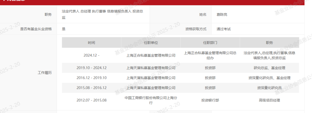 中基协公示信息显示,正合私募成立于2024年12月,公司的实际控制人葛陈亮曾任知名百亿级量化私募的研究总监、基金经理。具体来看,葛陈亮于2015年8月加盟该私募担任资深量化研究员,次年12月担任公司基金经理,2019年10月升任为公司研究总监,一直到去年12月创办正合私募之前才从该百亿级量化私募离职。