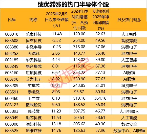 证券时报网讯,除了已经大幅上涨的个股外,半导体板块的“黑马潜力股”还有谁?据数据宝统计,2024年业绩预喜(略增、预增及扭亏,含快报),机构预测2025年净利润增幅超过20%;且2025年2月5日以来涨幅低于15%(跑输半导体行业指数),涉及算力、消费电子、AI眼镜、数据安全、云计算等热门概念的半导体个股共有16只,其中乐鑫科技、恒玄科技、中微半导3只个股2025年2月5日以来遭“错杀”,股价下跌。