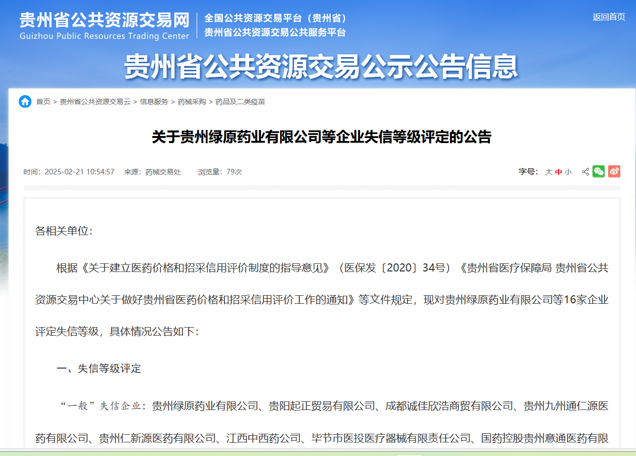 贵州公资交易中心公告,16家企业评定失信等级具体情况显示,“一般”失信企业为,贵州绿原药业有限公司、贵州九州通仁源医药有限公司、贵州仁新源医药有限公司、江西中西药公司等;“中等”失信企业,有贵州中鑫医药有限公司、普安县中西药公司;“严重”失信企业,有贵州慈惠医药有限公司、上海凯利泰医疗科技有限公司。