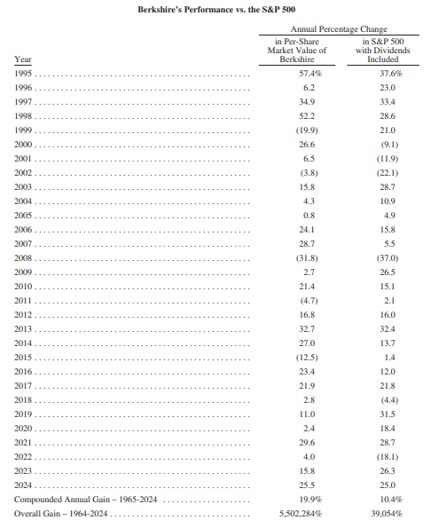 财报显示,2024年,伯克希尔每股市值的增幅为25.5%,标普500指数则为25%。巴菲特称,长期来看,1965年—2024年,伯克希尔每股市值的复合年增长率为19.9%,明显超过标普500指数的10.4%;1964年—2024年伯克希尔的市值增长率是令人吃惊的55022倍,而标普500指数为390倍。
