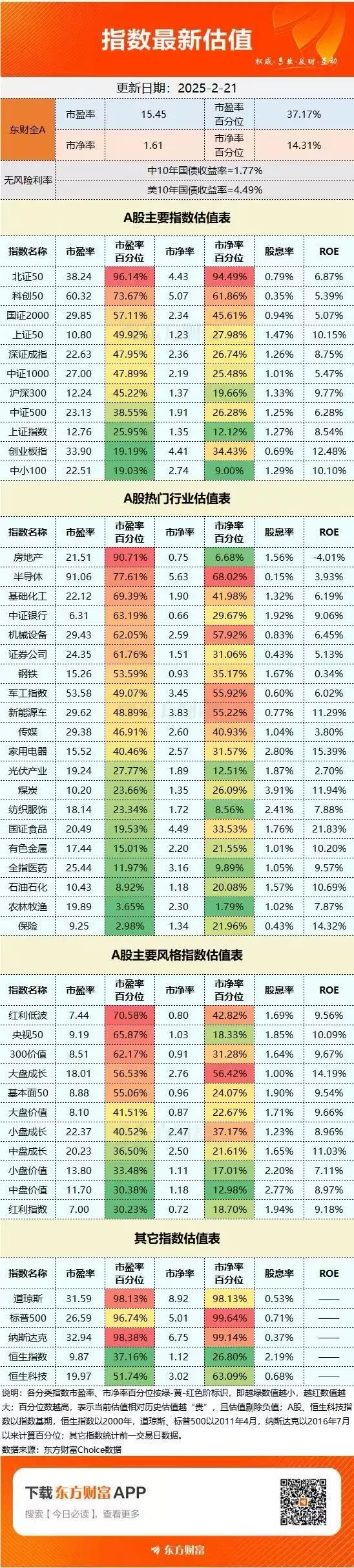 A股最新估值表(2025年2月21日)