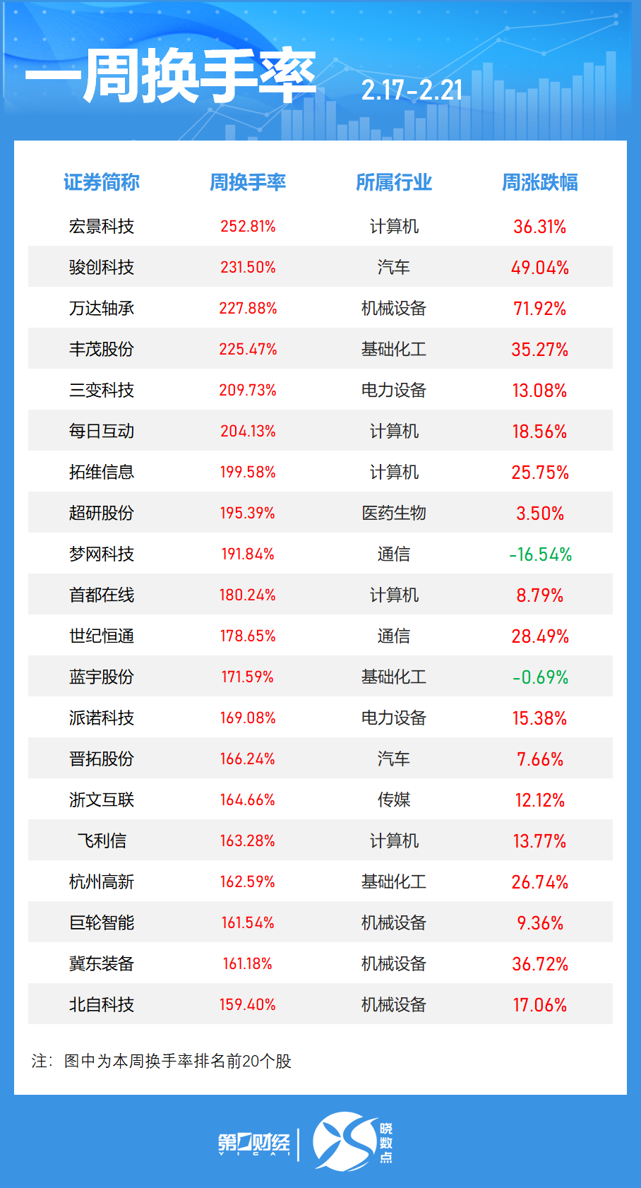 本周共有127只个股换手率超过100%,26只个股换手率超150%。其中,宏景科技排名居首,周换手率达到252.81%,骏创科技周换手率231.50%,万达轴承周换手率227.88%。
