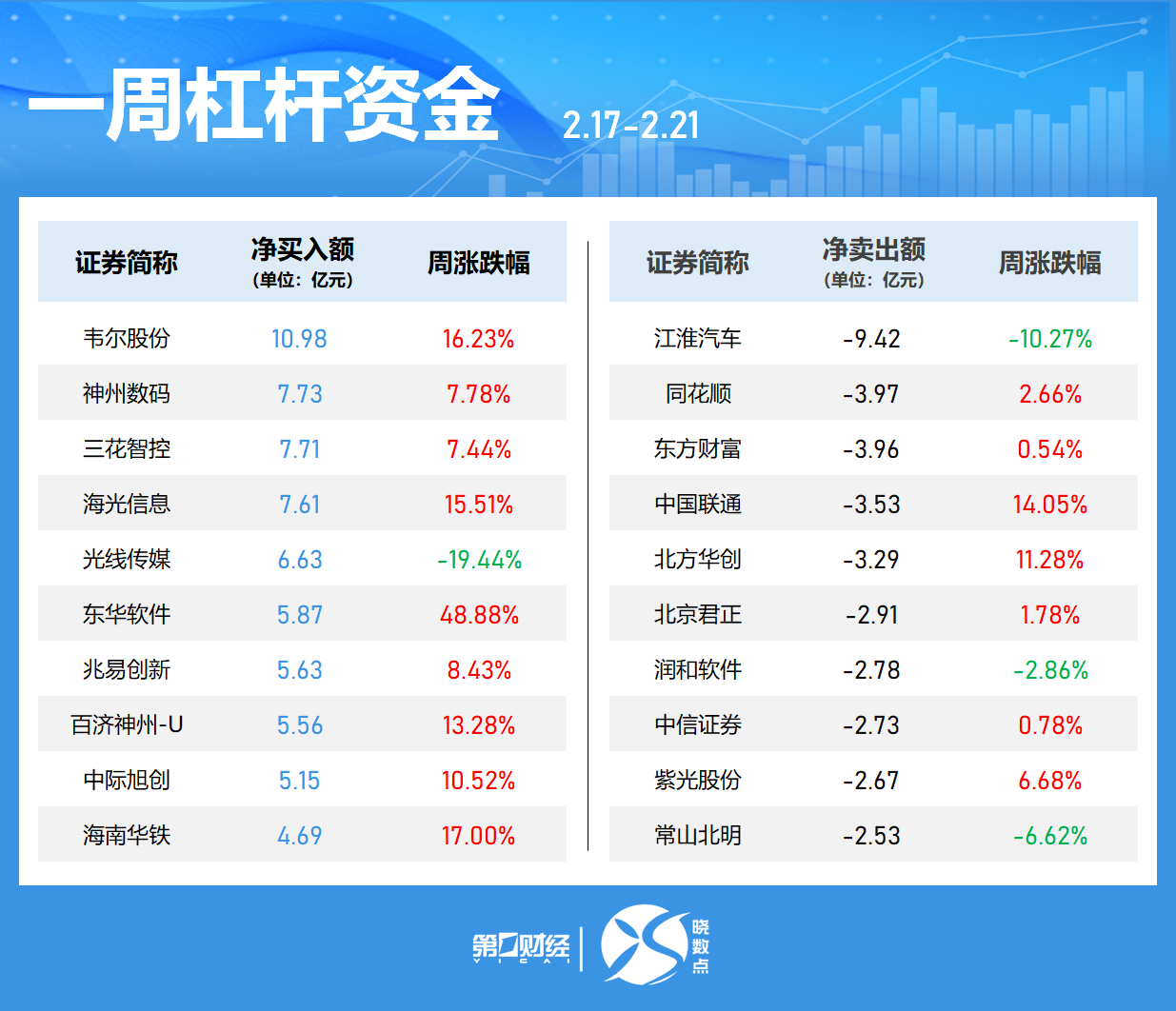 韦尔股份本周获融资净买入居首,净买入额为10.98亿元。神州数码、三花智控、海光信息获净买入居前;江淮汽车、同花顺、东方财富遭净卖出额居前,金额分别为9.42亿元、3.97亿元、3.96亿元。