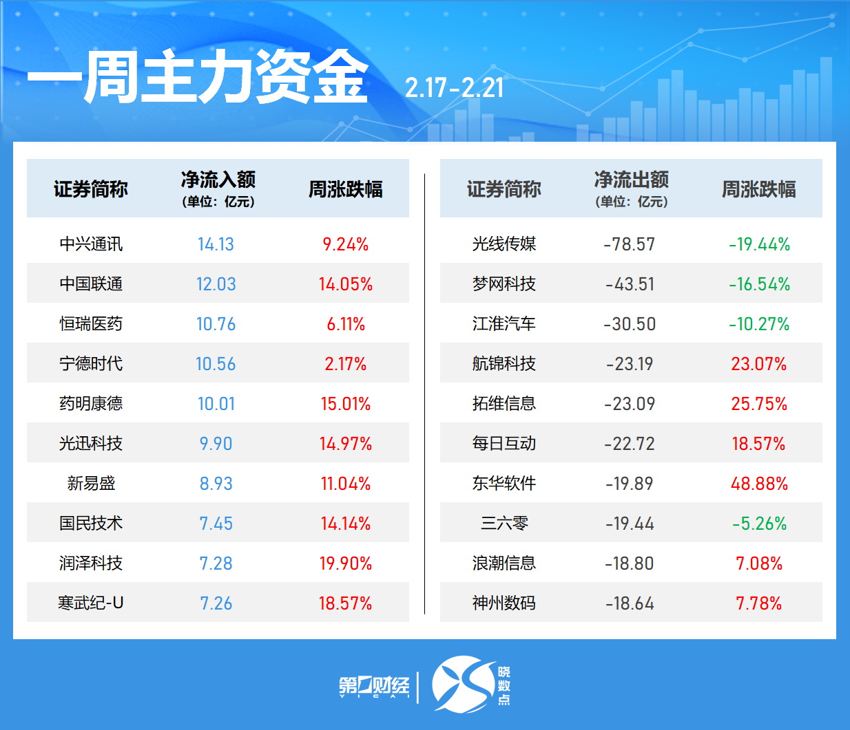 按申万一级行业来看,本周(2月17日至2月21日)五个交易日内,无行业获主力净流入,计算机、传媒、医药生物、基础化工、汽车、有色金属、非银金融等板块净流出额居前,其中计算机板块遭抛售超470亿元。