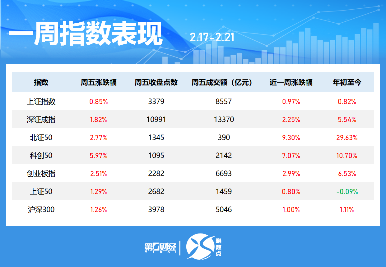 本周(2月17日至2月21日)A股三大指数集体上涨,沪指周涨0.97%,报3379.11点;深成指涨2.25%,创业板指涨2.99%。板块方面,通信、机械设备、电子、汽车、计算机等板块涨幅居前,煤炭、传媒、房地产、有色金属、石油石化等板块跌幅居前。