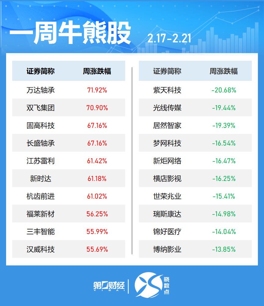 Wind数据显示,本周(2月17日至2月21日)共有32只个股涨幅超40%,13只个股涨超50%。本周机器人概念持续走高,概念股万达轴承、双飞集团、固高科技周涨幅居前,分别为71.92%、70.90%、67.16%。
