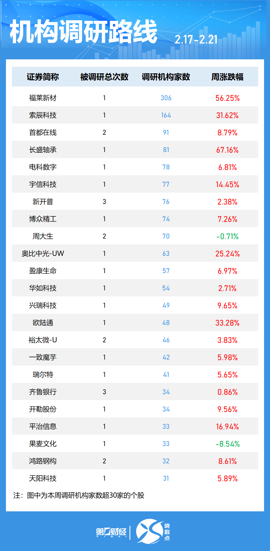 Wind数据显示,机构本周(2月17日至2月21日)共调研了172家上市公司,其中福莱新材最获关注,参与调研的机构达306家,索辰科技获得164家机构调研,首都在线获得91家机构调研。