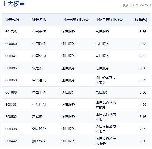 中证电信主题指数主要权重股