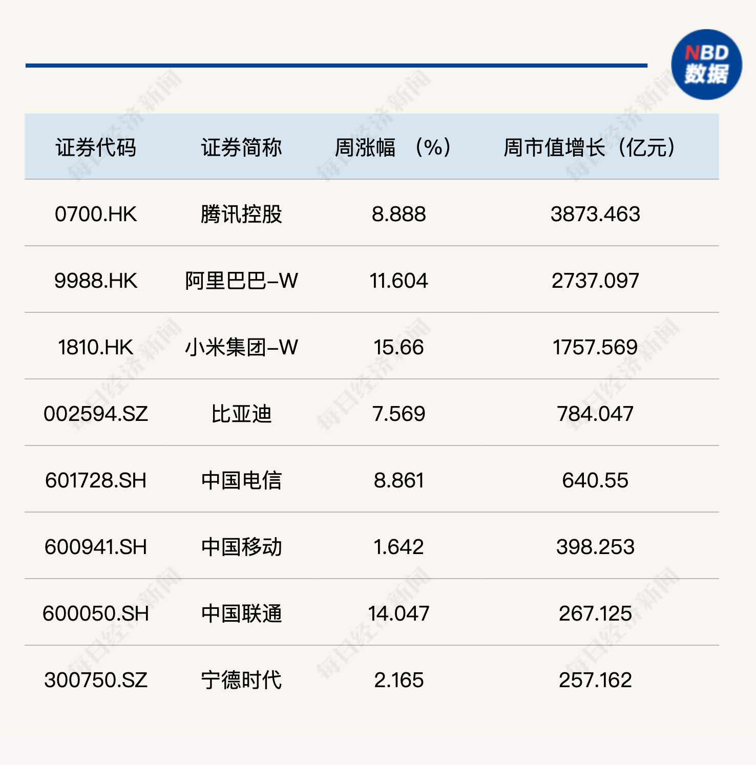在市值增长方面,腾讯控股、阿里巴巴以及小米集团周市值增长全部超过千亿元。其中,腾讯控股单周市值增长高达3873.46亿元。另外,比亚迪和中国电信的周市值增长均在500亿元以上,市值同样实现大幅增长。