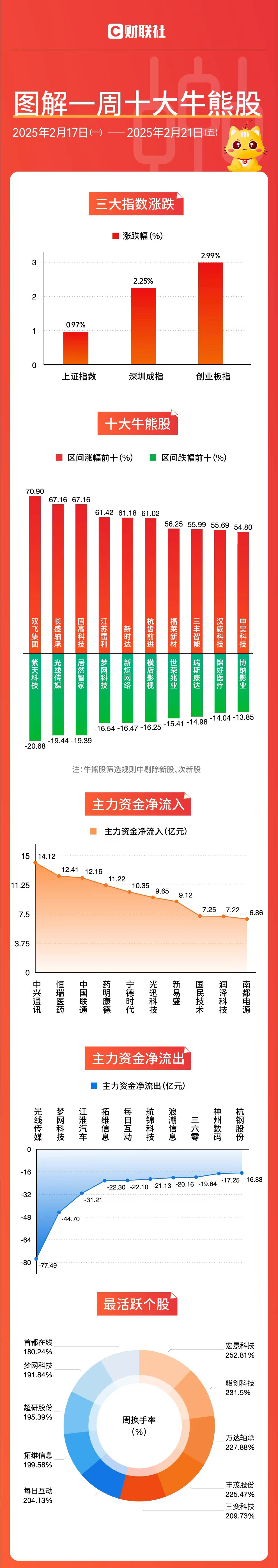 财联社2月23日讯,本周A股三大指数延续涨势,其中上证指数本周涨0.97%,深成指涨2.25%,创业板指涨2.99%。板块方面,本周通讯服务、算力板块涨幅居前,机器人概念股保持活跃。