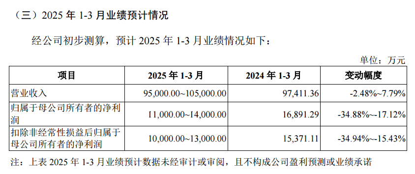 汉朔科技管理层初步预测,2025年第一季度,公司的营业收入为9.5亿元至10.5亿元,同比变动幅度为-2.48%至7.79%;归母净利润为1.1亿元至1.4亿元,同比变动幅度为-34.88%至-17.12%。