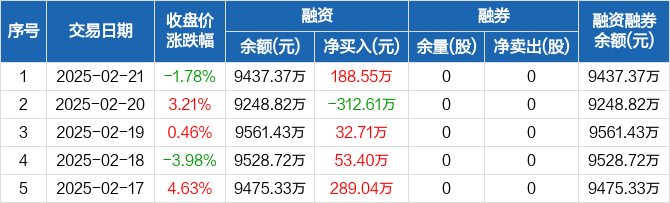 融资方面,当日融资买入452.44万元,融资偿还263.89万元,融资净买入188.55万元。融券方面,融券卖出0股,融券偿还0股,融券余量0股,融券余额0元。融资融券余额合计9437.37万元。