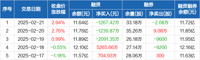融资方面,当日融资买入1.94亿元,融资偿还2.06亿元,融资净偿还1267.42万元,连续3日净偿还累计4598.64万元。融券方面,融券卖出5.32万股,融券偿还7.4万股,融券余量33.18万股,融券余额826.18万元。融资融券余额合计11.72亿元。