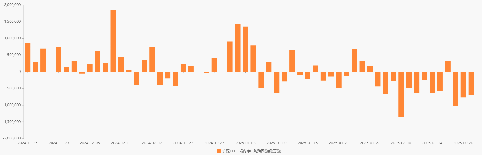 上周五(2月21日),东方财富Choice数据显示,场内股票型ETF净赎回70.10亿份;其中,沪市股票型ETF净赎回53.83亿份,深市股票型ETF净赎回16.27亿份。以最新净值计,上周五市场净赎回49.27亿元。
