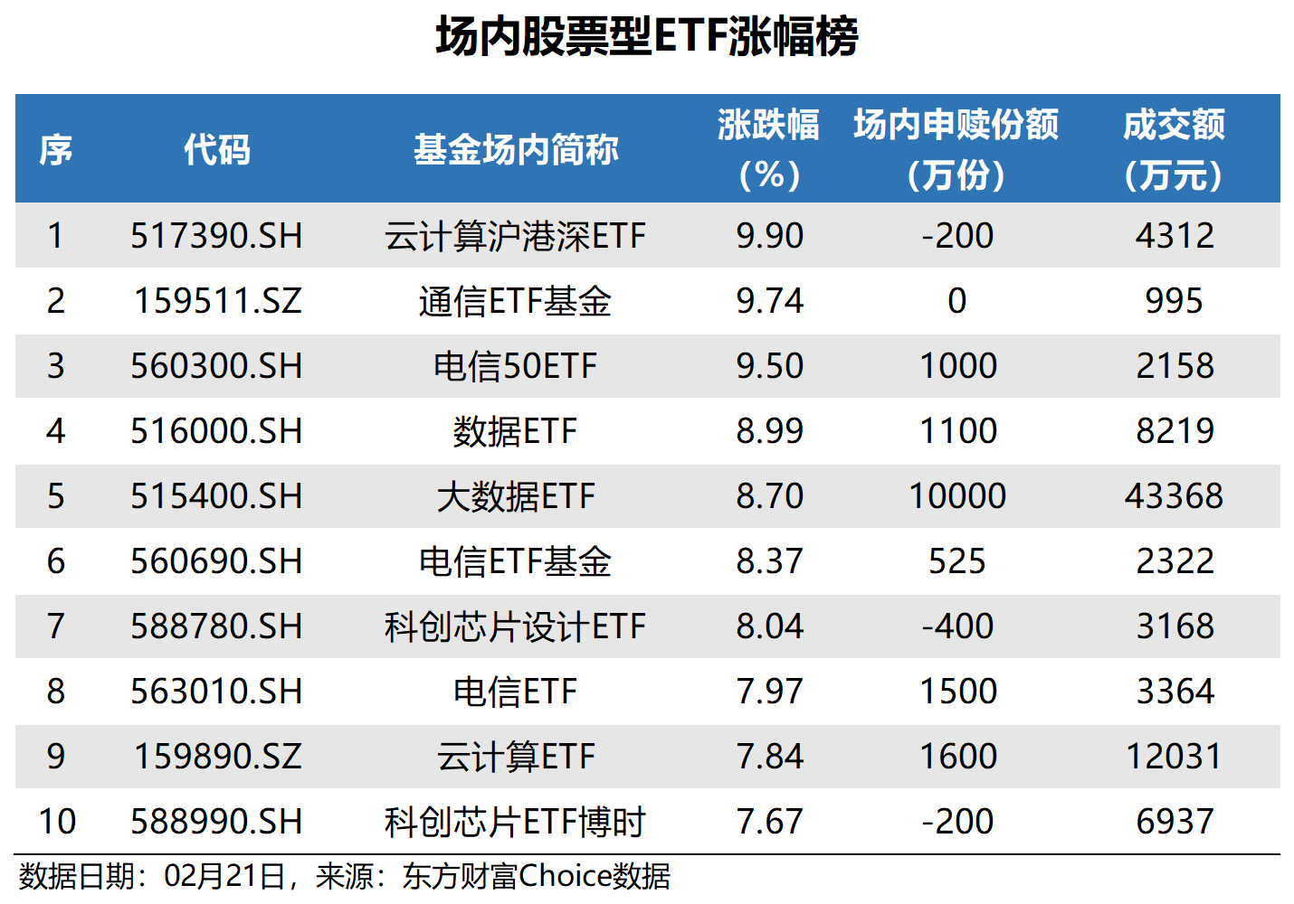 数据显示,上周五场内股票型ETF中,云计算沪港深ETF、通信ETF基金、电信50ETF涨幅居前。其中,云计算沪港深ETF涨幅最大,达9.90%。