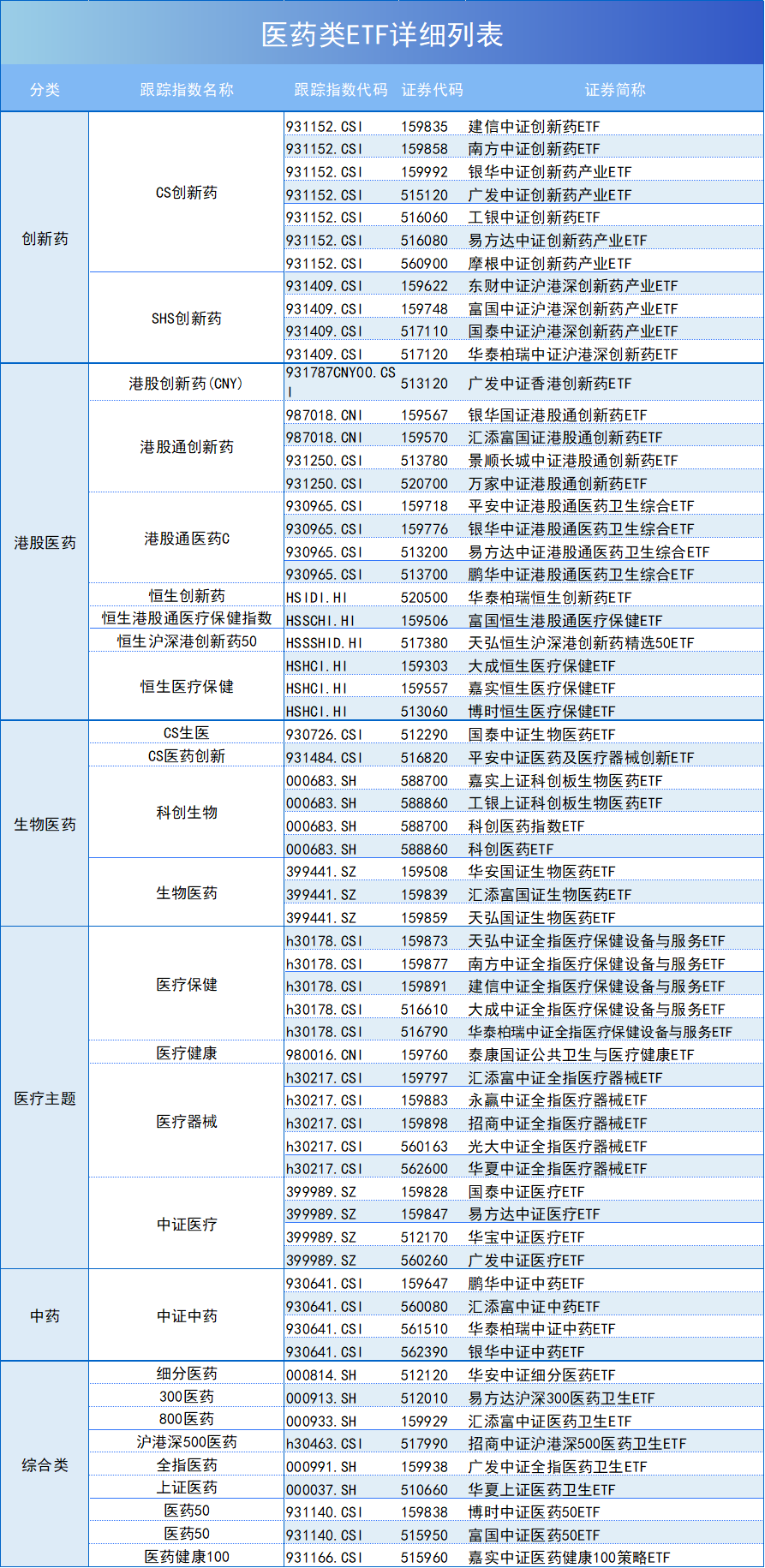 由于医药子行业及标的众多,ETF品种亦琳琅满目,既有覆盖面广的综合类医药指数产品,也有针对细分领域或主板、科创板、创业板的专项指数产品。