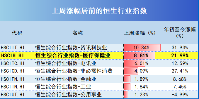 沪深300二级行业指数中,医药生物行业以4.19%的周涨幅居首。港股市场恒生综合行业指数中,医疗保健业以8.81%的周涨幅排名第二,今年以来涨幅超过20%。阿里健康(00241.HK)和医渡科技(02158.HK)今年涨幅分别达到81.93%和71.82%。