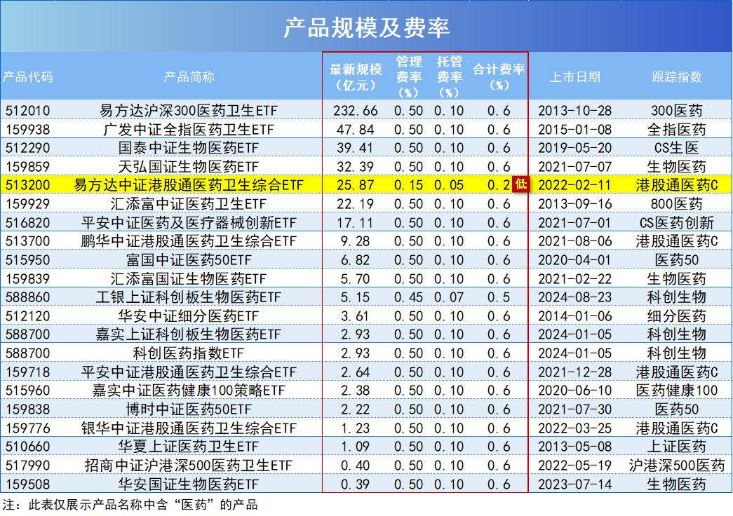 数据显示,跟踪中证港股通医药卫生综合指数的3只ETF产品周涨幅接近10%。其中,涨幅最高的为易方达中证港股通医药卫生综合ETF(513200),一周获资金净流入1.94亿元,流通规模增长15.59%至25.87亿元。该产品是目前医药ETF产品中费率最低的——管理费率每年0.15%,托管费率每年0.05%,合计费率每年0.2%。交易成本优势或是其获得资金青睐的原因之一。
