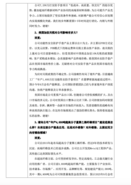 为应对关税政策的不确定性,公司战略性布局了境外产能,目前越南工厂“年产1,600万打功能性安防手套项目”在紧锣密鼓地建设过程中,预计今年6月会有产能释放。公司国际营销团队已经与多家境外客户深度沟通,协商产能释放及订单承接事宜。