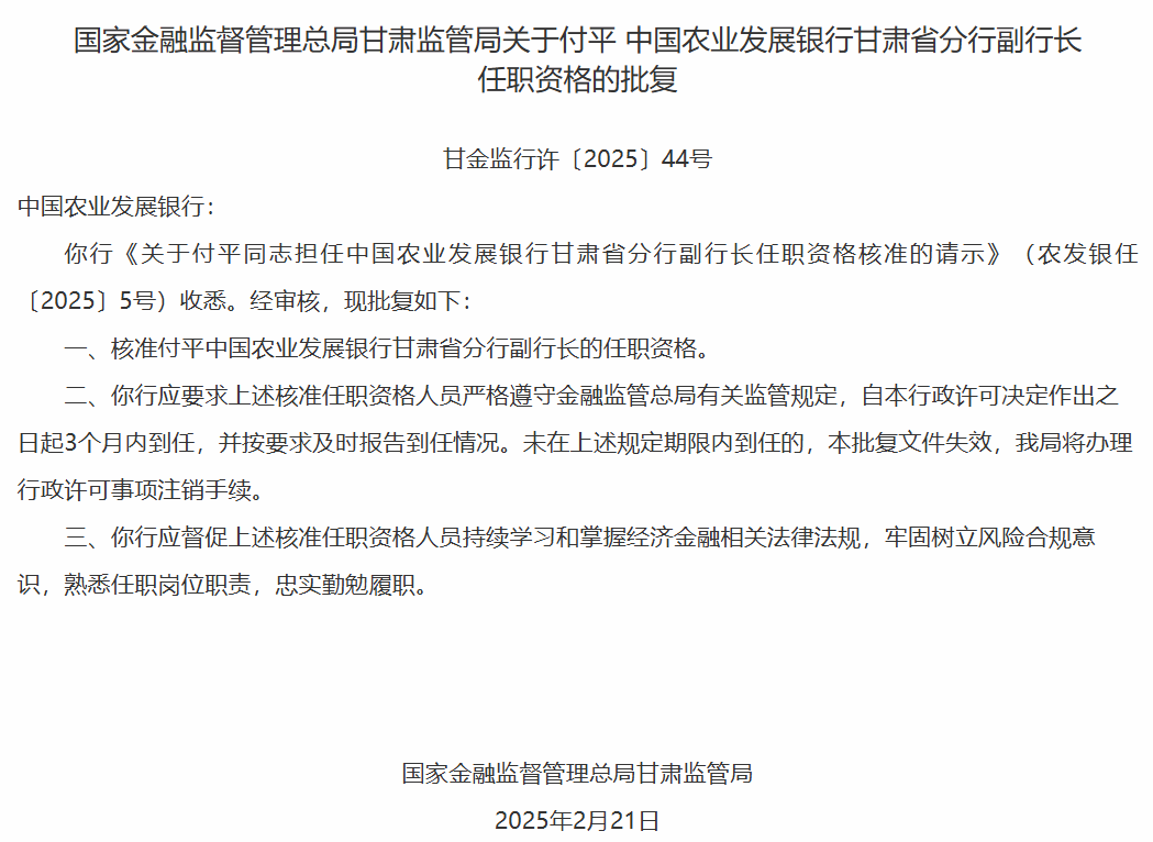 2月24日,国家金融监督管理总局甘肃监管局正式发布了关于付平任职资格的批复(甘金监行许〔2025〕44号)。该批复核准了付平担任中国农业发展银行甘肃省分行副行长的职务。