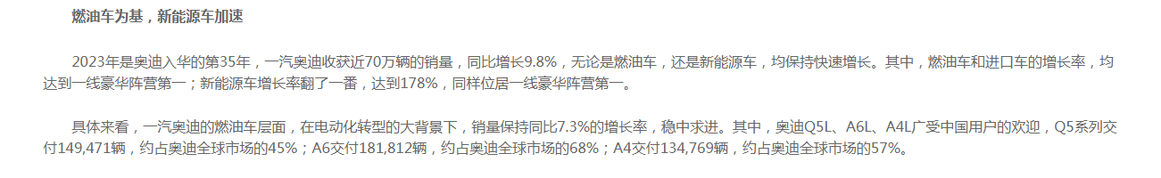 2023年,一汽奥迪实现近70万辆的销量,同比增长9.8%。其中,A6交付18.2万辆,约占奥迪全球市场的68%。Q5系列交付14.9万辆,约占奥迪全球市场的45%,A4销售了13.5万辆,约占奥迪全球市场的57%。