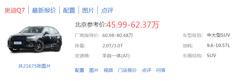 日前,市场传来还未国产的奥迪Q7降价的消息,其报价已经跌破50万元。第三方平台易车显示,奥迪Q7在北京的参考报价已经降至45.99万元,较官方最低指导价下降了14.99万元。