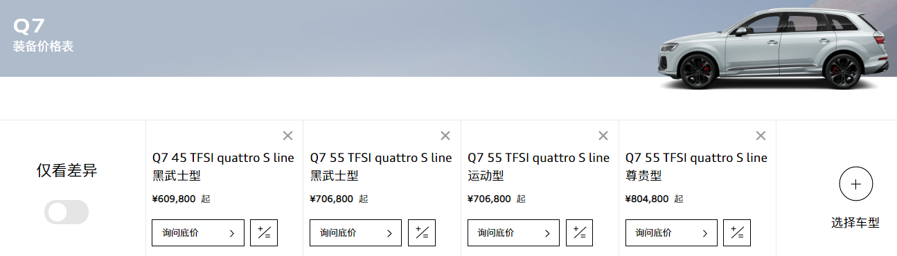 当前,奥迪Q7仍是纯进口车。一汽奥迪官网显示,该车系目前共有四个配置,最低配的45 TFSI quattro S line黑武士型官方指导价60.98万元,最高配的55 TFSI quattro S line尊贵型官方指导价80.48万元。