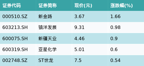 截至收盘,氯碱主题涨跌幅最高的五只股票为:新金路(000510.SZ)、镇洋发展(603213.SH)、新疆天业(600075.SH)、亚星化学(600319.SH)与ST世龙(002748.SZ)。详情见下表: