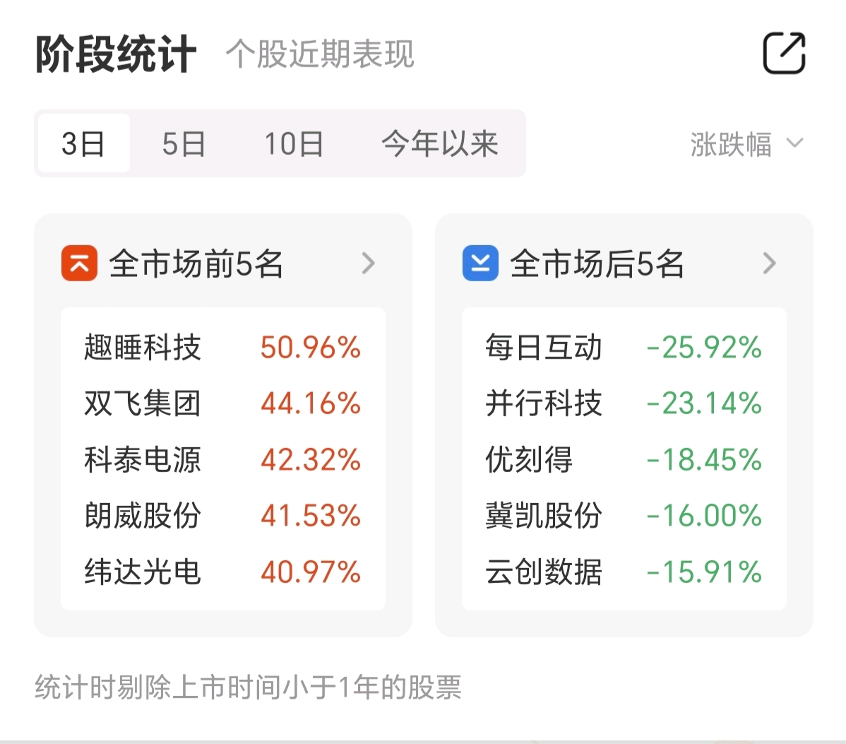2月24日市场全天震荡调整,近三个交易日里,A股全市场涨幅前五名分别为趣睡科技、双飞集团、科泰电源、朗威股份、纬达光电,其中趣睡科技三日涨幅达50.96%,位列涨幅榜第一。