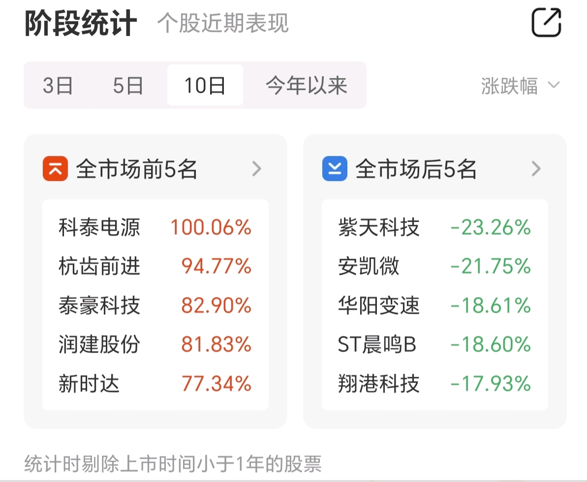 与此同时,近十个交易日涨幅前五名的个股分别为科泰电源、杭齿前进、泰豪科技、润建股份、新时达。