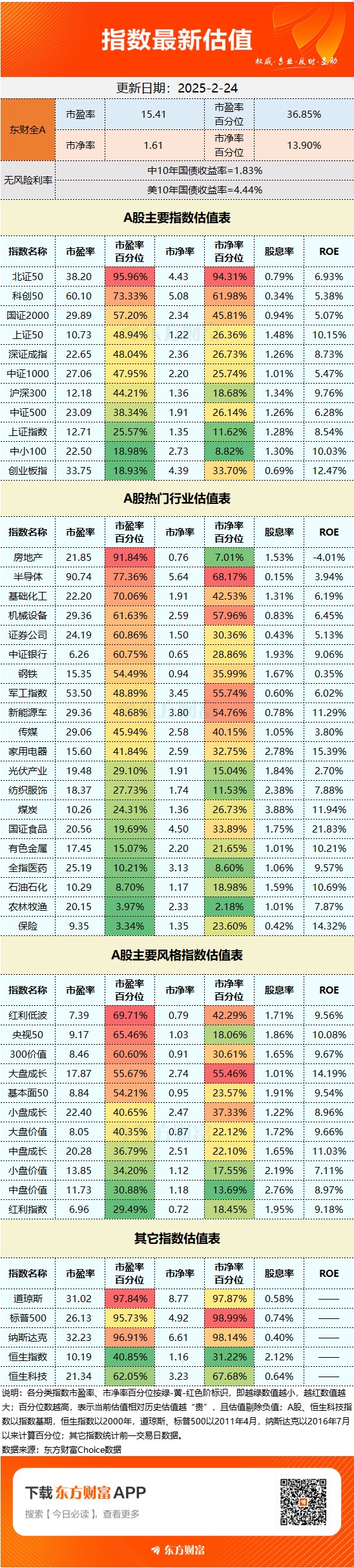 截至2月24日收盘,东方财富Choice数据显示,东财全A市盈率为15.41倍,市盈率百分位为36.85%;市净率为1.61倍,市净率百分位13.9%。
