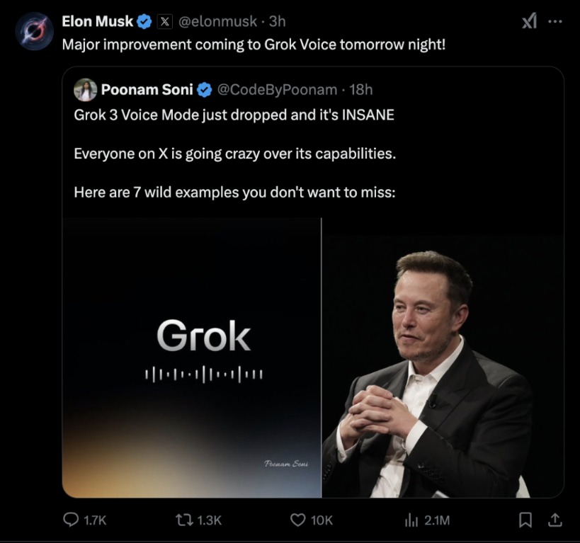 2月24日,特斯拉CEO埃隆·马斯克在旗下社交媒体平台X上宣布,将于明晚(2月25日)推出Grok语音模式的重大更新。