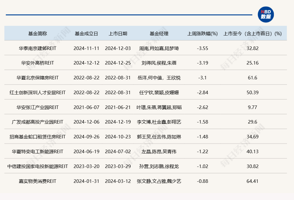 环比下跌的产品则为20只,跌幅最大的三只产品分别是华泰南京建邺REIT、华安外高桥REIT和华夏北京保障房REIT,周内涨跌幅分别为-3.55%、-3.19%和-3.10%。