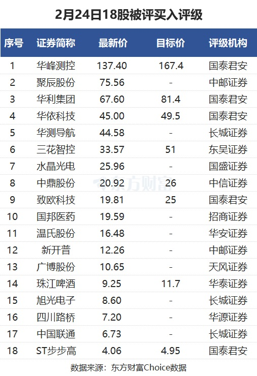 东方财富Choice数据显示,截至2月24日19点,当天有18股被券商评为买入评级,包括华峰测控、三花智控、水晶光电、温氏股份、珠江啤酒、中国联通等股票。
