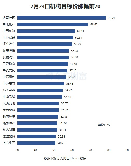 以近一月券商研报为样本,按机构目标价(有多家券商给出目标价的,取最大值)和最新收盘价相比,截至2月24日收盘,迪哲医药上涨空间最大,为78.24%。