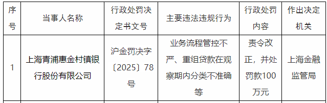 上海青浦惠金村镇银行被罚100万元