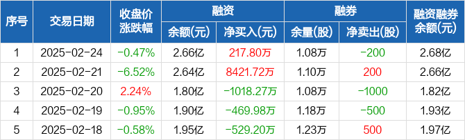 融资方面,当日融资买入3550.28万元,融资偿还3332.48万元,融资净买入217.8万元。融券方面,融券卖出300股,融券偿还500股,融券余量1.08万股,融券余额231.76万元。融资融券余额合计2.68亿元。