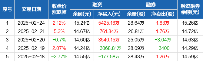 融资方面,当日融资买入2.34亿元,融资偿还1.8亿元,融资净买入5425.16万元,连续3日净买入累计9726.65万元。融券方面,融券卖出3.77万股,融券偿还1.94万股,融券余量28.64万股,融券余额482.58万元。融资融券余额合计15.26亿元。