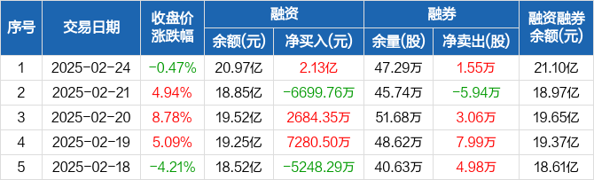 长盈精密融资融券信息显示,2025年2月24日融资净买入2.13亿元;融资余额20.97亿元,创历史新高,较前一日增加11.28%。
