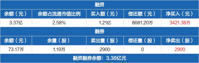 融资方面,当日融资买入1.21亿元,融资偿还8681.2万元,融资净买入3421.38万元,连续3日净买入累计9513.1万元。融券方面,融券卖出2900股,融券偿还0股,融券余量1.19万股,融券余额73.17万元。融资融券余额合计3.38亿元。
