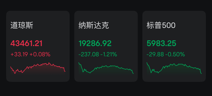 当地时间周一,美国三大股指收盘涨跌不一。截至收盘,道指涨0.08%报43461.21点,标普500指数跌0.5%报5983.25点,纳指跌1.21%报19286.92点。