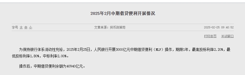 据中国人民银行官网消息,为保持银行体系流动性充裕,2025年2月25日,人民银行开展3000亿元中期借贷便利(MLF)操作,期限1年,最高投标利率2.20%,最低投标利率1.80%,中标利率2.00%。操作后,中期借贷便利余额为40940亿元。