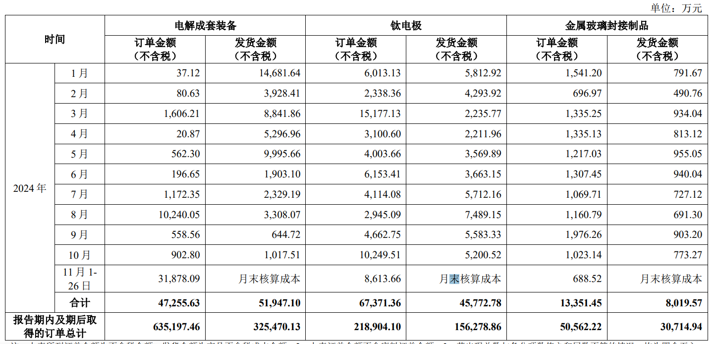 钛电极是公司的第二大业务,同期,泰金新能获得的订单金额分别为3.57亿元、5.71亿元、5.89亿元及6.74亿元,主要原因是铜箔钛阳极和湿法冶金钛阳极订单有所增加。