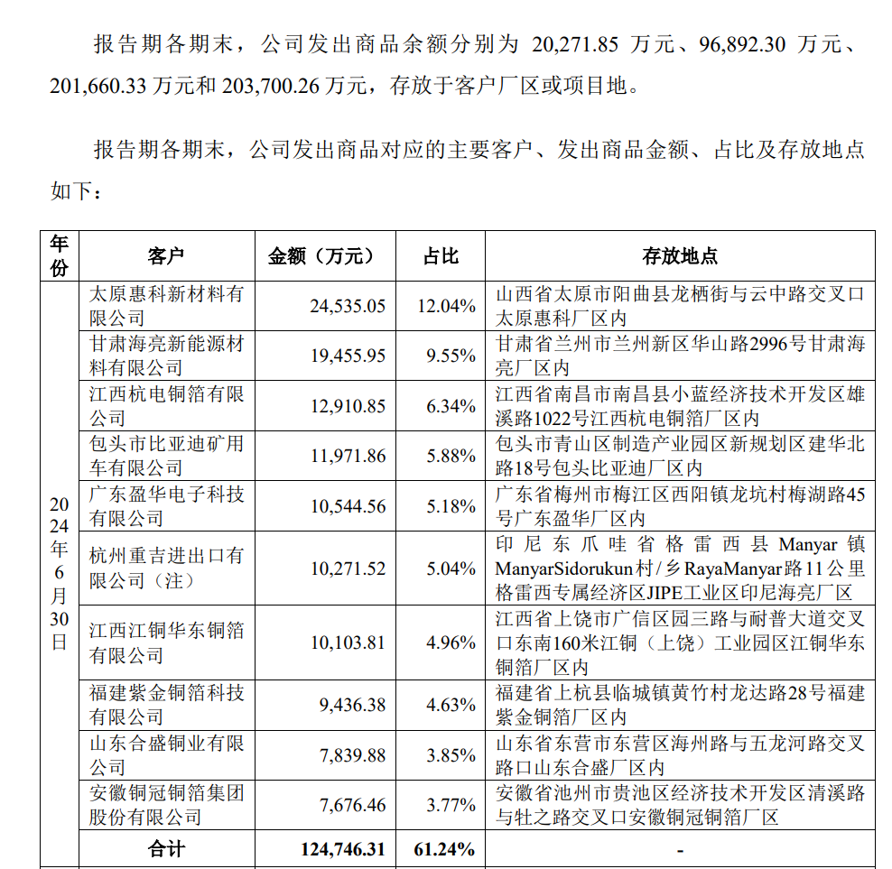 据回复函,泰金新能列举了截至2024年6月底的前十大发出商品客户,涉及金额为12.47亿元,主要位于国内9个省及印度尼西亚等。