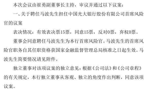 2月24日,光大银行(601818)发布公告称,董事会同意聘任马波为首席风险官,马波的首席风险官职务自其任职资格获国家金融监督管理总局核准之日起生效。